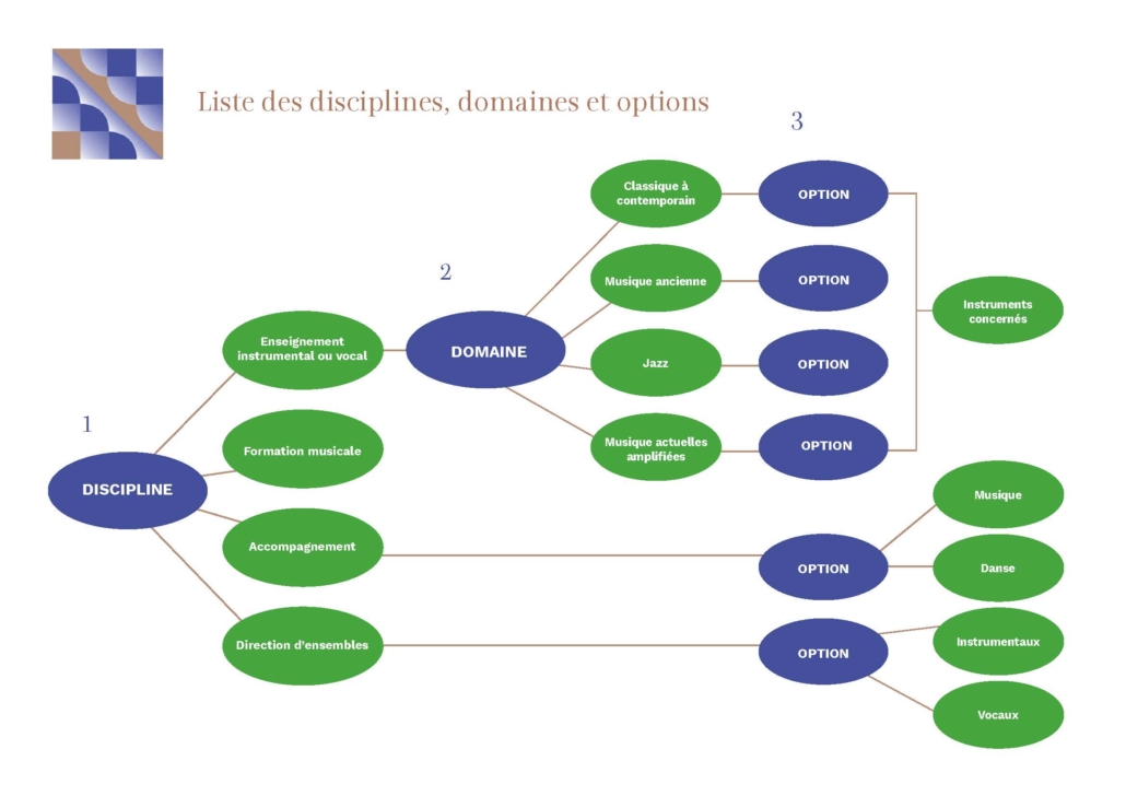 Pour vous guider dans votre inscription, voici ci-dessous un schéma des disciplines, domaines et options proposés au Pôle musique et danse.