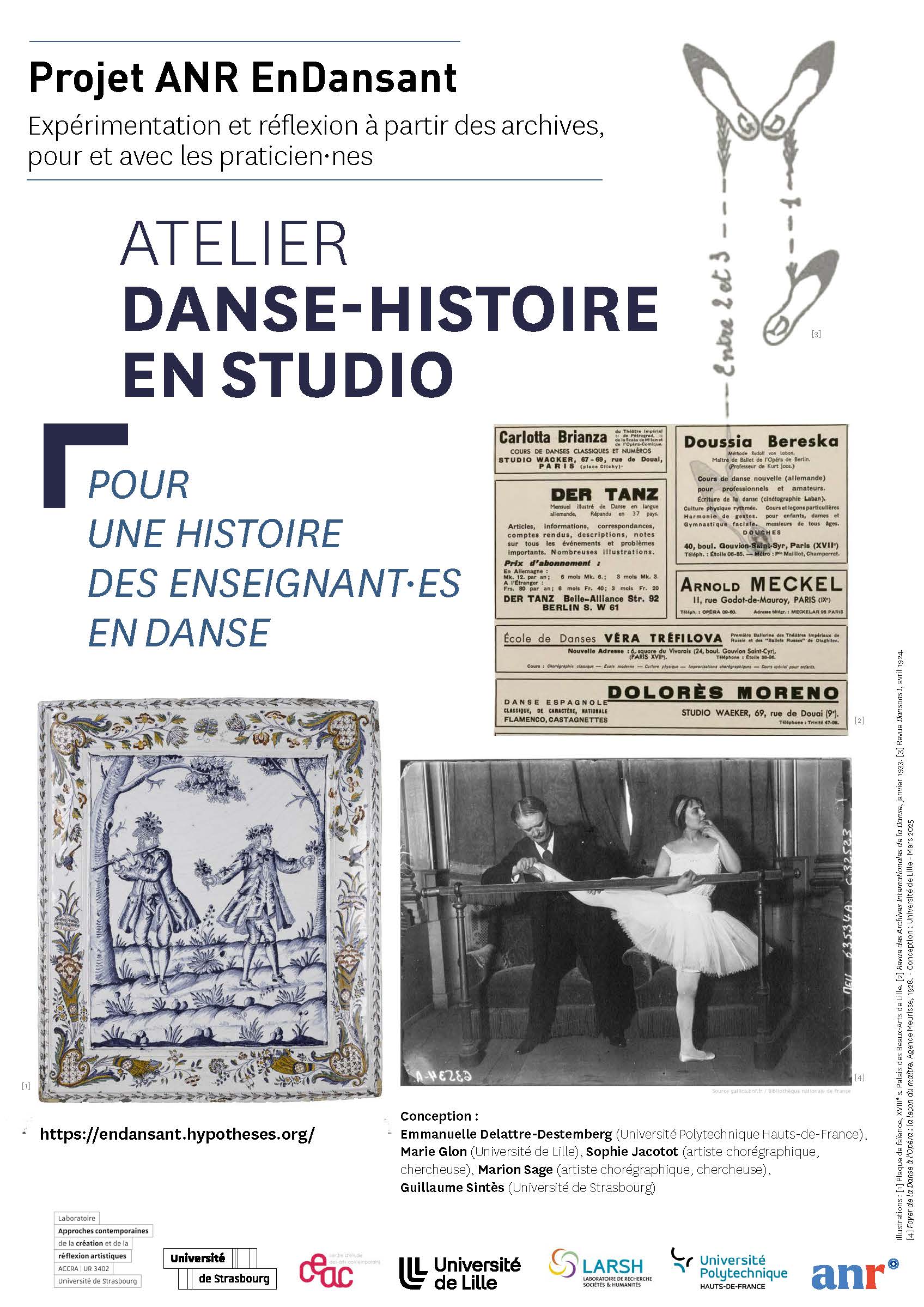 Cet atelier est financé par le projet ANR EnDansant – Pour une histoire des enseignant-es en danse, piloté par Emmanuelle Delattre-Destemberg (université Polytechnique Hauts-de-France), Marie Glon (université de Lille) et Guillaume Sintès (université de Strasbourg). Il s’adresse aux professeur-es de danse : toutes celles et ceux qui souhaitent découvrir les archives de cette activité et qui sont prêt-es à explorer, échanger et partager leurs expériences sur leur pratique de la transmission sont les bienvenu-es.